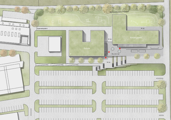 Die prägnante Hanglage des Wettbewerbsgrundstückes ist entwurfsbestimmend: das vorgeschlagene Gebäudeensemble begleitet die vorhandene Höhenentwicklung und fügt sich harmonisch in die Umgebung ein. Das Gelände wird unmerklich neu modelliert. Die gemeinschaftlich genutzten Flächen in der Basisebene übernehmen die Funktion einer Stützmauer. Der zweigeschossige Schulbaukörper und der eingeschossige Kindergartenbaukörper werden an diese Gemeinschaftsfläche angebunden und ermöglichen somit eine Vielzahl an Nutzungen. Die notwendige Trennung der Funktionen bleibt dennoch gewahrt, um einen geborgenen Schul- und Kindergartenbetrieb zu gewährleisten. Mögliche Synergien zwischen Schule und Kita werden gefördert.
