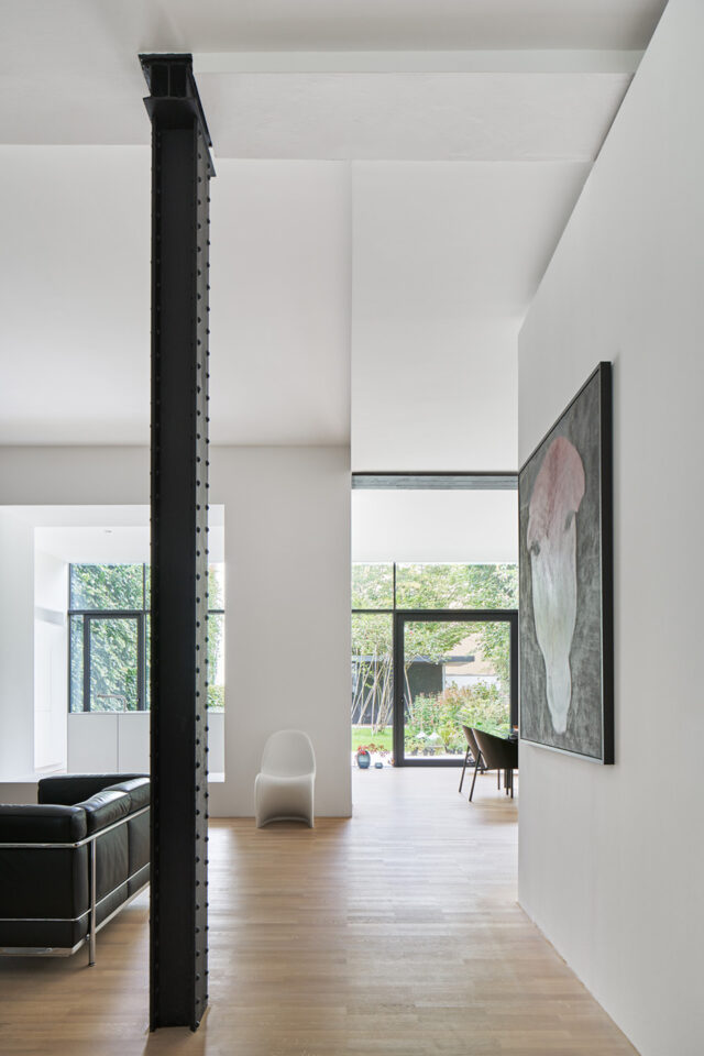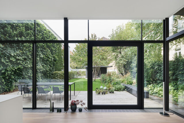 Das bestehende Hofgebäude wurde auf den unteren beiden Ebenen so umgebaut und erweitert, dass großzügige helle Räume entstehen, die fast einem Neubau gleichen, wenn nicht eine alte genietete Stahlstütze an die eigentliche historische Bausubstanz erinnern würde. Die Grenzen zwischen Innen- und Außenraum scheinen sich aufzulösen. Mit großer Sorgfalt und präzisem Detail wurde ein anspruchsvolles Projekt umgesetzt, das zeigt, dass unsere Innenstädte zum Bewohnen noch längst nicht ausgedient haben.“