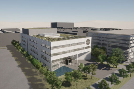 Über dem Atrium sorgt ein leichtes Folienkissendach für viel Licht. Es ist umgeben von PV-Modulen, die Solarstrom für den Energiebedarf des Gebäudes erzeugen. Das Hauptdach des Gebäudes erhält ein begrüntes Retentionsdach. Aufgrund des Klimawandels werden solche Dächer in Städten immer wichtiger, da sie bei Starkregen wie Schwämme wirken. Sie helfen, Wasser zu speichern und Überschwemmungen zu verhindern. Außerdem kühlen sie die Umgebung durch Verdunstung.