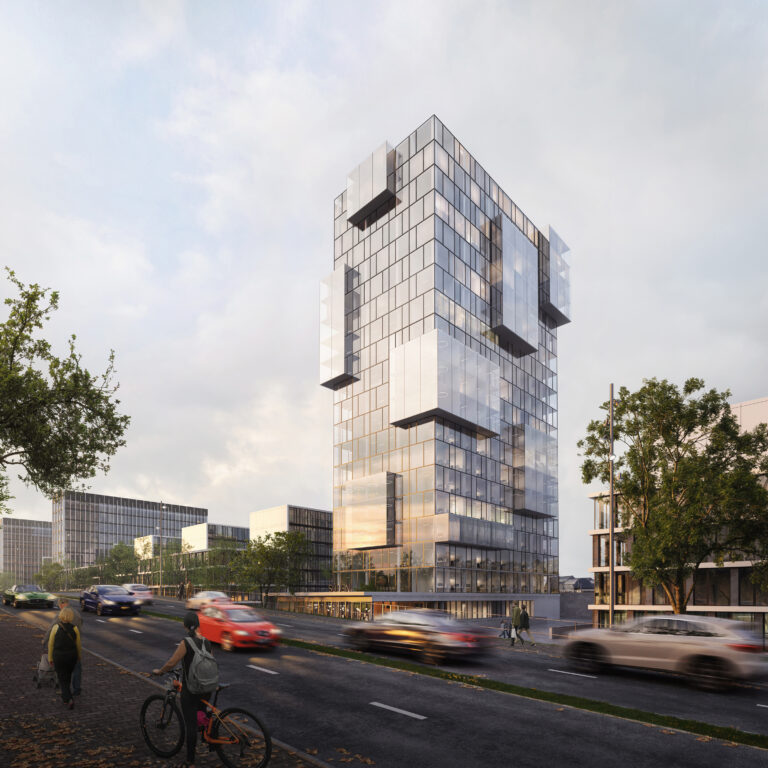 Es wird eine Typologie gewählt, die im Raster und den Bebauungslinien des Kontextes steht, sich bezüglich Kubatur und Fassade aber davon freispielt. Es wird ein mehrschichtiges vertikales Volumen entwickelt, das durch Transparenzen, Vor- und Rücksprüngen von Bauteilen eine unverwechselbare Signifikanz entwickelt, besonders auch illuminiert bei Dämmerung und nachts.