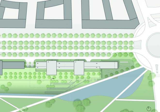 Das Wettbewerbsgrundstück liegt in prominenter Lage des südöstlichen Stadteingangs von Karlsruhe. Es ist der Auftakt zu einer Reihe von Gebäuden, die den nördlichen Abschluss des Stadtparks Südost bilden.