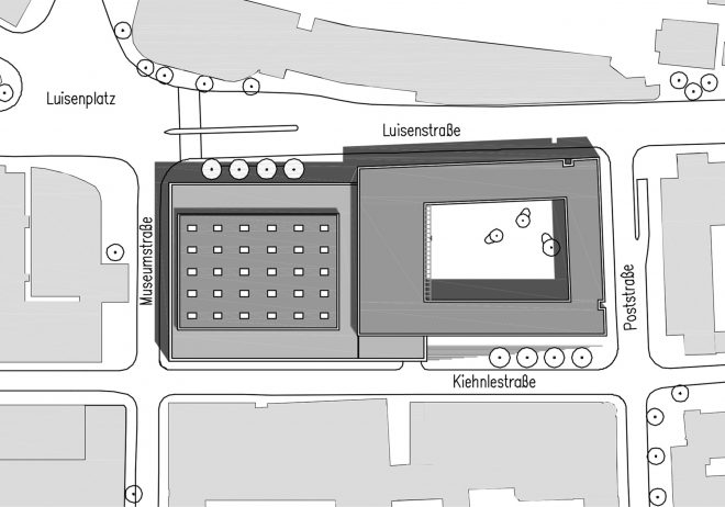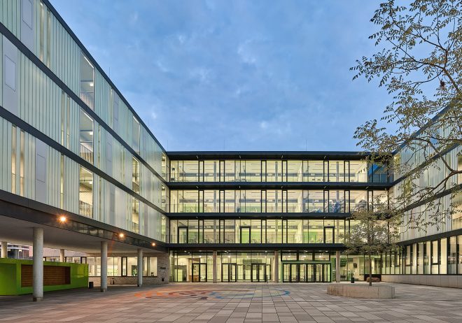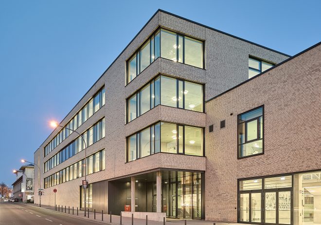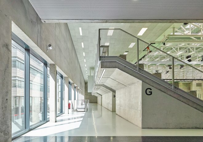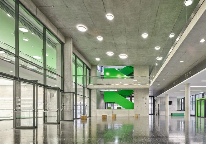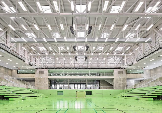 Gymnasium und Sporthalle reagieren einheitlich in Materialität und Formensprache auf die verschiedenen städtebaulichen Rahmenbedingungen. Die beiden Nutzungen werden über die großzügige, teilweise zweigeschossige, multifunktionale Aula und Eingangshalle erschlossen. Diese kann bei Veranstaltungen wahlweise der Schule oder der Sporthalle zugeordnet und auch separat genutzt werden.