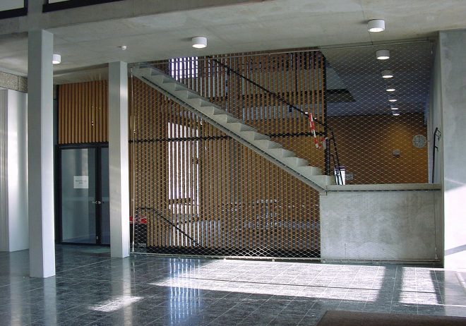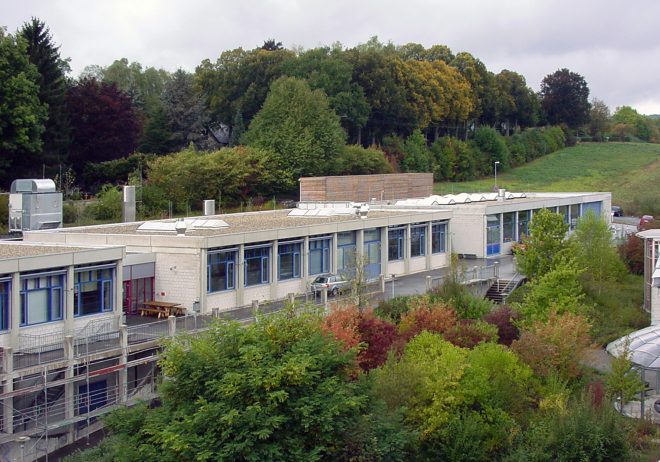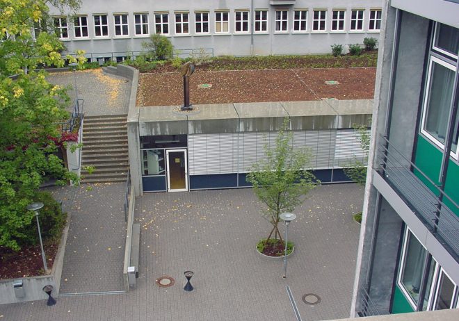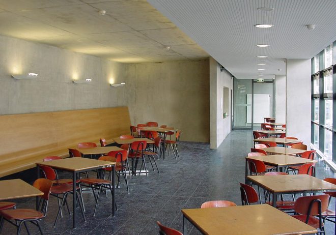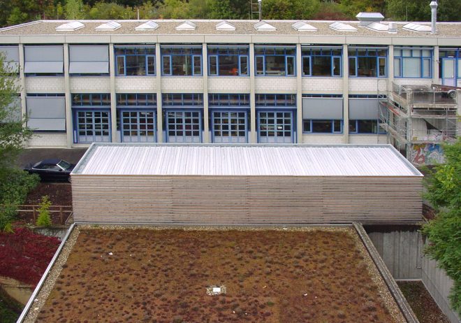 Der streng gerasterte dreibündige Schulbau aus den 60er Jahren wurde in mehreren Bauabschnitten erweitert und saniert: