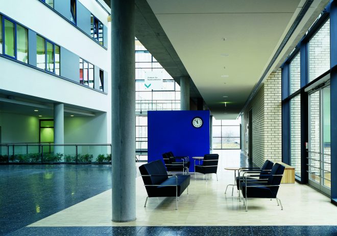 zentralisierte Untersuchungs- und Behandlungsbereiche, 5 Operationsräume mit Zentralsterilisation, Verwaltungsbereich mit sozialen Diensten, Ver- und Entsorgungsbereiche.