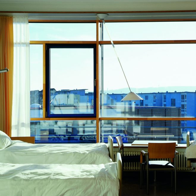 Es werden 4 Bettenstationen sowie eine interdisziplinäre Intensivstation mit insgesamt 130 Betten neu errichtet. Der Neubau schließt eine Lücke zwischen der bestehenden medizinischen Klinik und der Hautklinik, erschließt alle Kliniken über einen neuen Eingangsbereich und sorgt für die funktionale Verknüpfung des gesamten Krankenhauses. - BA: Aufstockung Entbindungsbereich und Neonatologie