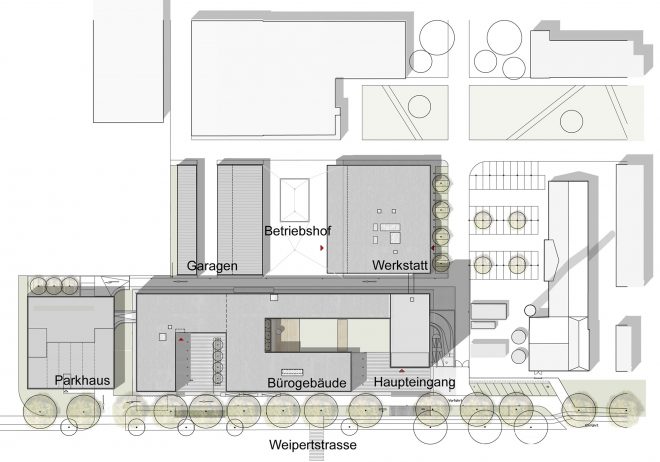 Die Planung umfasst ein 4-geschossiges Bürogebäude mit 7-geschossigem Turm, ein Werkstattgebäude, Garagengebäude und ein offenes Parkhaus.