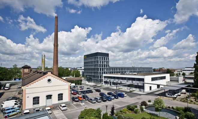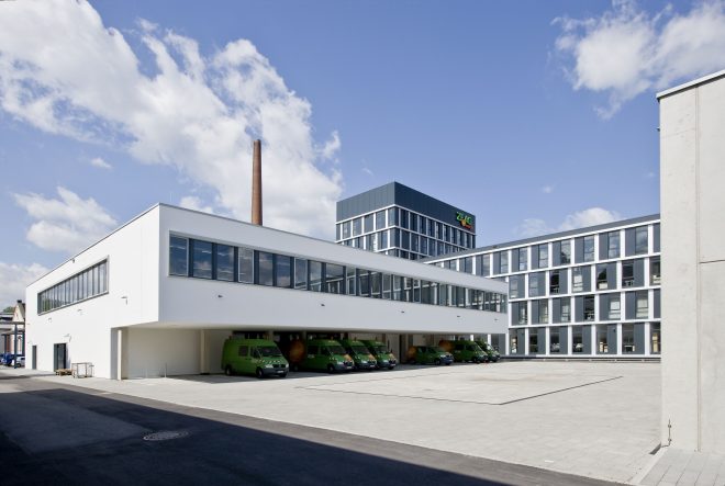 Die neue Firmenzentrale für ca. 400 Mitarbeiter an der Weipertstraße präsentiert sich als kompaktes und markantes Gebäude in einem heterogenen Umfeld.