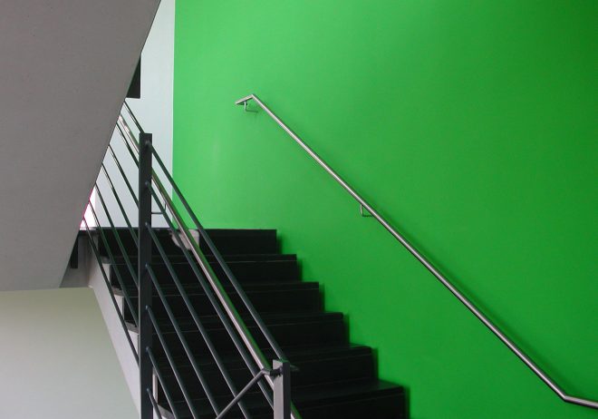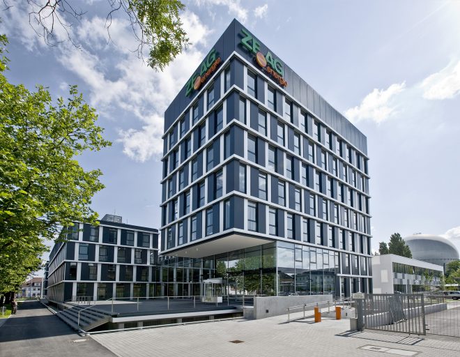 Die einseitige Auskragung akzentuiert den Haupteingang und verleiht dem Bürogebäude ein prägendes Profil. Die offene Parkgarage unter dem Bürogebäude unterstreicht die Idee der „schwebenden Sockelplatte“.