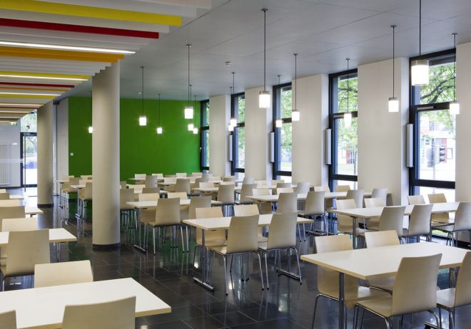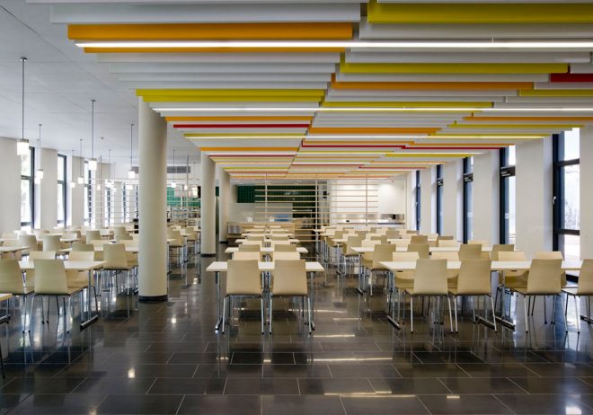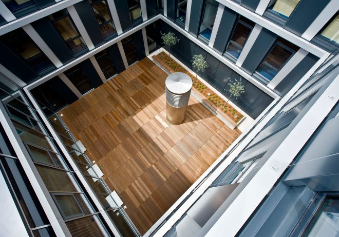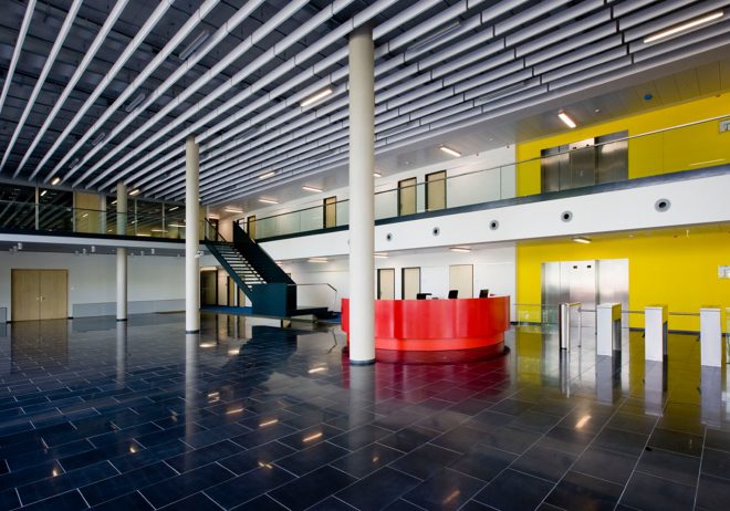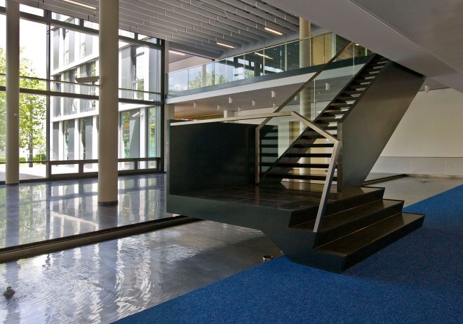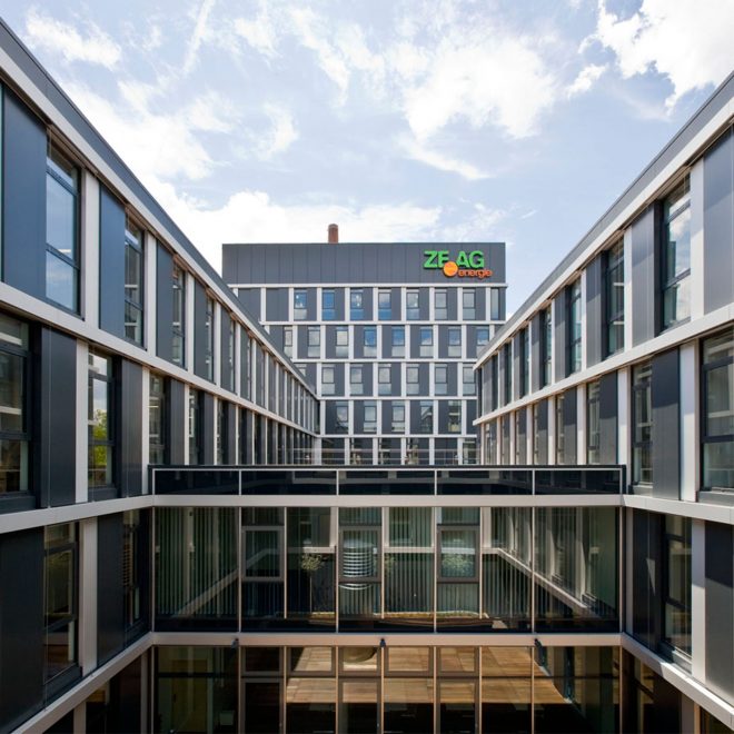 Der leicht angehobene, artifiziell gestaltete Platz auf der Sockelplatte und das großzügig verglaste Foyer bilden das Entree des Energiestandortes Heilbronn. Die 2-geschossige Halle mit Foyer, Ausstellungsbereich, dem Restaurant und dem zuschaltbaren Vortragssaal liegt im Kern der Gebäudeanlage. Aus dieser zentralen Halle erreichen Besucher und Mitarbeiter auf kurzen und übersichtlichen Wegen alle relevanten Funktionsbereiche.