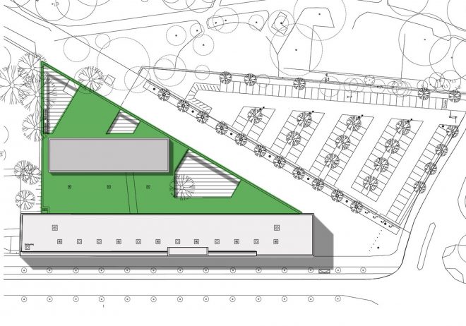 Eine begrünte Massivholzplatte ergänzt niveaugleich das Sporthallendach und überspannt das gesamte Schulgrundstück. Die verlängerte historische Fächerstrasse wird von der durchgehenden Dachkante begleitet.