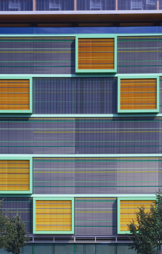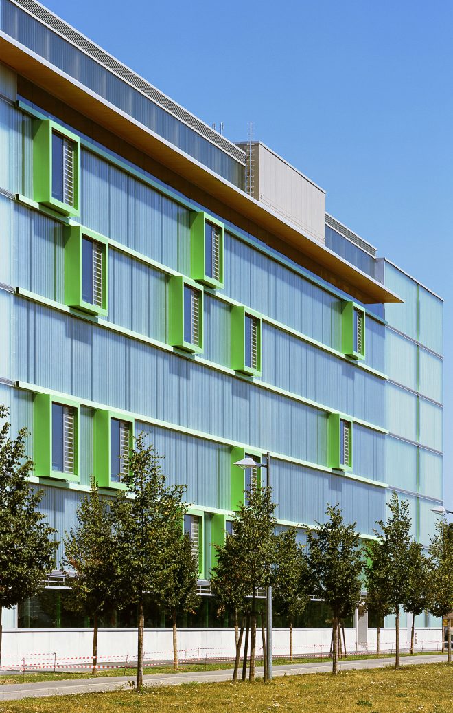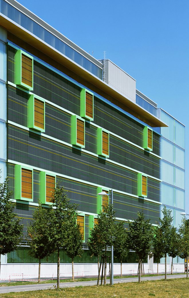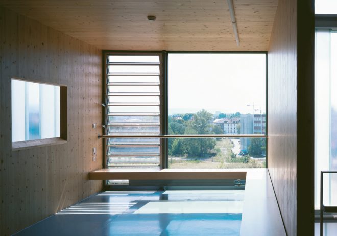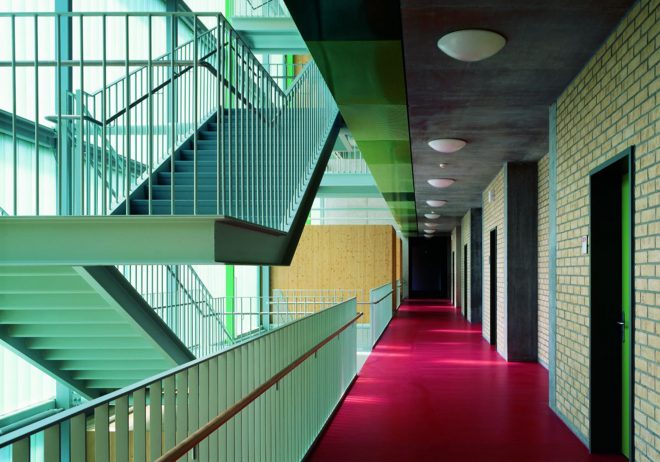 Die Orientierung der Klassenräume zum ruhigen, im Norden gelegenen Stadtpark ermöglicht die natürliche Belüftung und die Reduzierung der thermischen Lasten im Sommer.