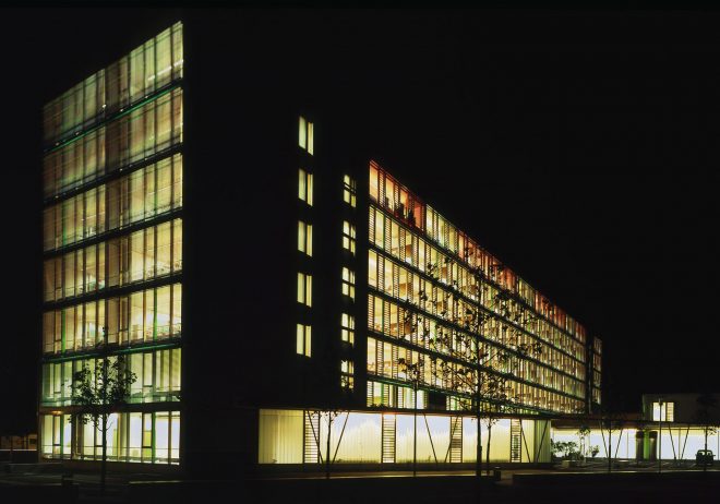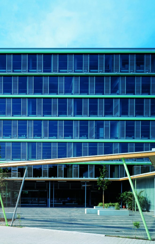 Zur stark befahrenen Ludwig-Erhardt-Allee sind ausschließlich Erschließungs- und Kommunikationszonen in einer gebäudehohen verglasten Halle mit Galerien, offenen Treppen, Aufenthalts- und Arbeitsbereichen orientiert.