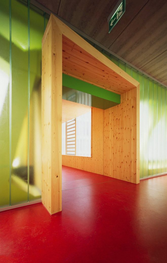 Schule und Sporthalle werden einheitlich von einer gläsernen Bekleidung umhüllt. Diese transluzente bis transparente Hülle, reagiert differenziert auf konstruktive Anforderungen und vor allem auf das heterogene städtische Umfeld. Abhängig von den Umgebungsbedingungen verändert die Schule wie ein Chamäleon ihr Aussehen über den gesamten Tagesverlauf. Bei bewölktem Himmel mutiert die Schule gar zum milchig-grün schimmernden Eisblock. Mit Beginn der Dämmerung offenbaren die transluzenten Glasflächen das nun beleuchtete Innenleben der Schule.