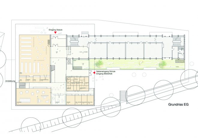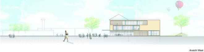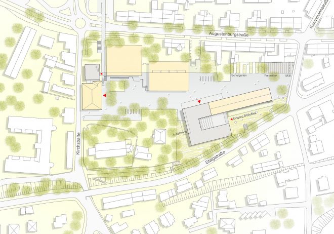 Die Erweiterung des Schlossschulgebäudes wird nördlich des Bestandsbaus platziert. Durch einen leichten Versatz in der Bauflucht und durch eine zurückversetzte Glasfuge (Luftraum und Aufzug) zwischen Bestand und Neubau bleibt der Solitärcharakter des denkmalgeschützten Bestandbaus erhalten. Der Neubau orientiert sich an den Gebäudelängen der Nachbarschaft.