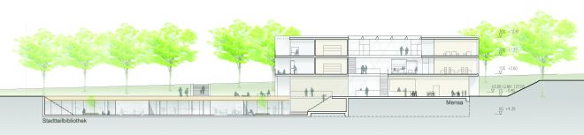 Der neue Erweiterungsbau des Heinrich-Dietrich-Baus nimmt die Höhe und die Richtung des Bestandes auf und bildet gemeinsam mit diesem einen eigenständigen Baukörper auf dem Schulcampus.