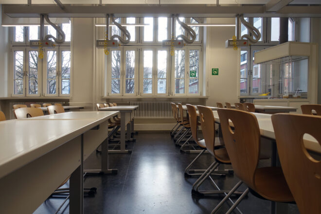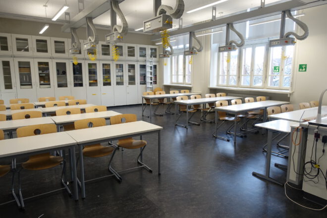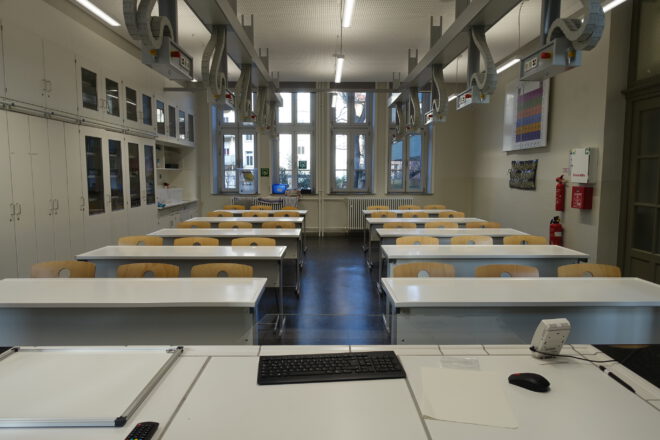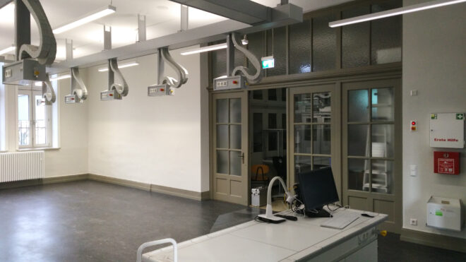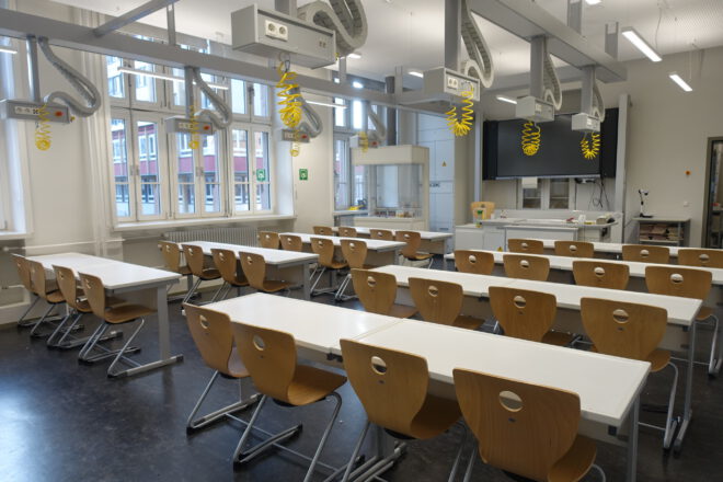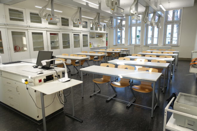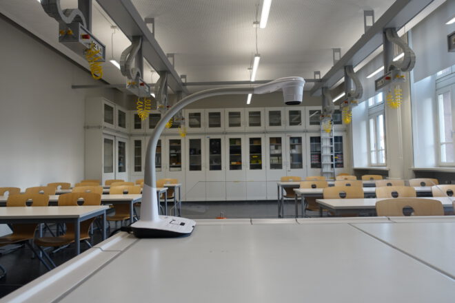 Das aufsteigende Gestühl ist entfallen. Alle Fachräume erhielten ein Mediendeckensystem, eine Tafelanlage mit Aktivboard und neue Möbel. Die Vorbereitungsräume bzw. Sammlungsräume wurden ebenfalls komplett neu ausgestattet.