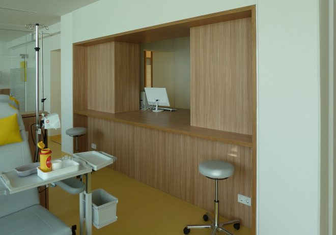 Das bestehende Untergeschoss des Verwaltungsgebäudes wurde saniert, brandschutztechnisch ertüchtigt und durch einen Anbau erweitert. Zukünftig sind im MVZ eine Praxis für Kardiologie und eine Praxis für Onkologie untergebracht.