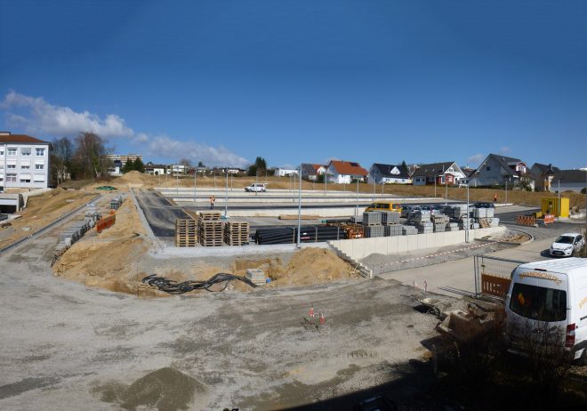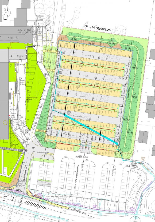 Errichtung einer Stellplatzanlage mit ca. 250 Stellplätzen auf einem Grundstück östlich der GRN-Klinik Sinsheim. Die Parkierung staffelt sich entsprechend des Geländeverlaufes und ist von der Hauptstraße / B39 direkt erschlossen. Der Um- und Ausbau der Einfahrt mit einem zusätzlichen Abbiegefahrstreifen war erforderlich.