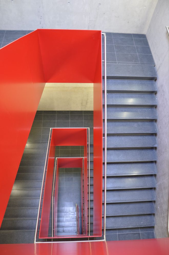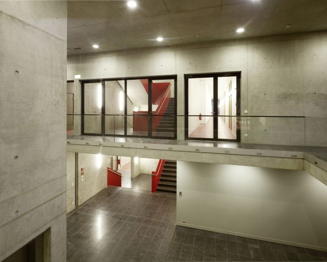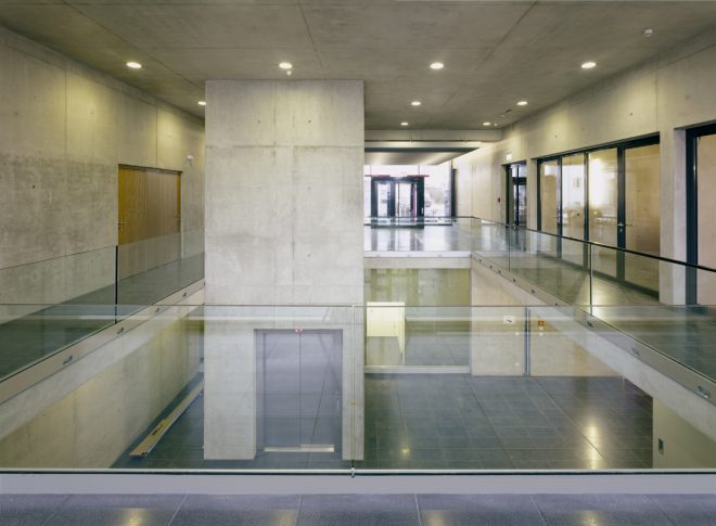 Die Transparenz und leichte Materialität des Neubaus unterstützt die gewünschte Offenheit und den Bezug zum Campus. Die horizontale Schichtung des Gebäudes unterstreicht den Niveausprung zwischen Straße und Hof. Eine zweigeschossige Eingangshalle verbindet das Straßengeschoss mit dem Hofgeschoss. Diese Halle ist das Informations- und Kommunikationszentrum des Instituts.
