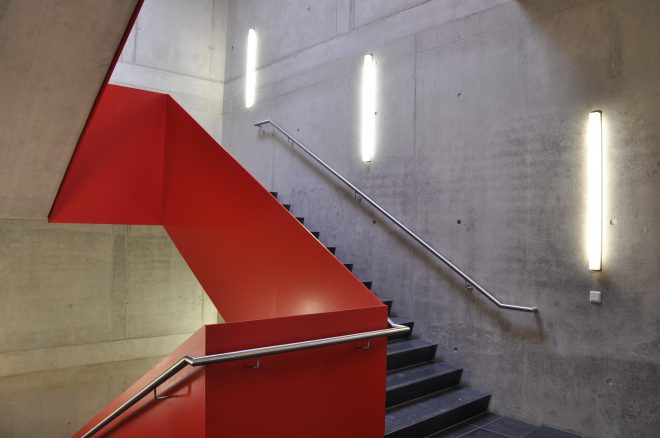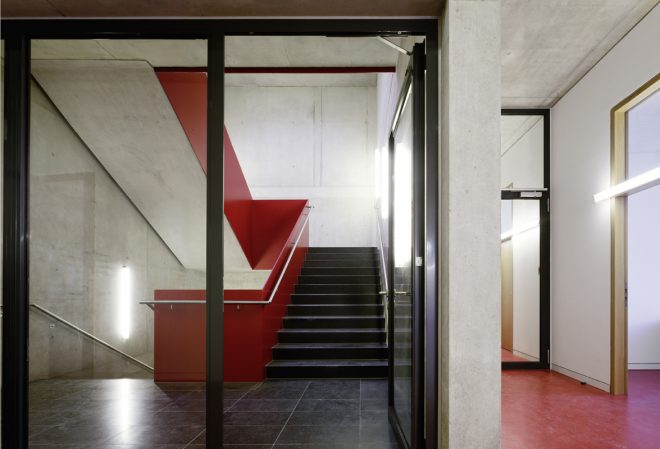 Wenige Materialien, die möglichst in ihrer Eigenfarbigkeit belassen wurden, und eine einzige kräftige, kontrastierende Farbe prägen den Innenausbau und schaffen eine ruhige und ansprechende Architektur.