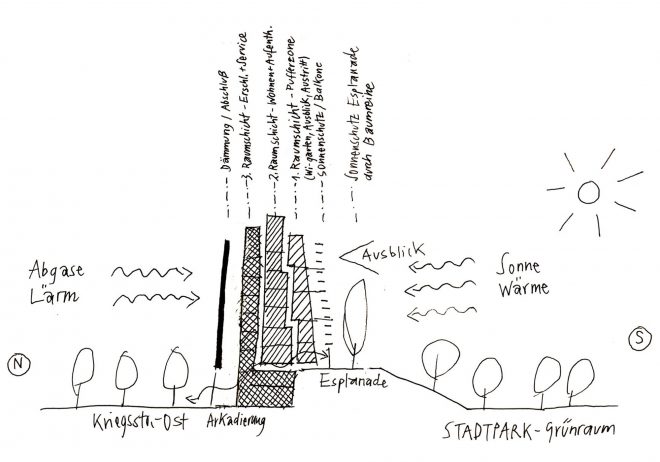 In Zusammenarbeit mit dem Stadtplanungsamt Karlsruhe wurde unser Wettbewerbsentwurf in verschiedenen Planungsgutachten weiterbearbeitet bis zur Bebauungsplanreife.