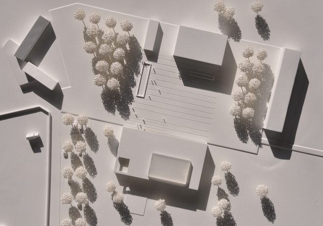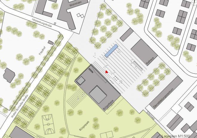 Das Erscheinungsbild des Gebäudes ist geprägt durch eine einfache Geometrie und eine prägnante Materialität. Seine streng orthogonale Struktur unterstützt die Vorgaben der städtebaulichen Rahmenplanung und stärkt das Konzept der neuen Ortsmitte.