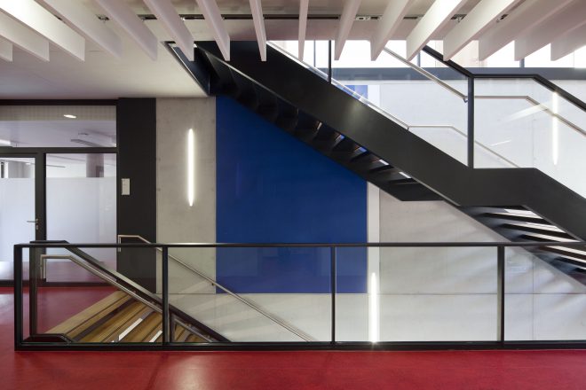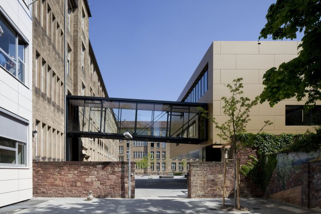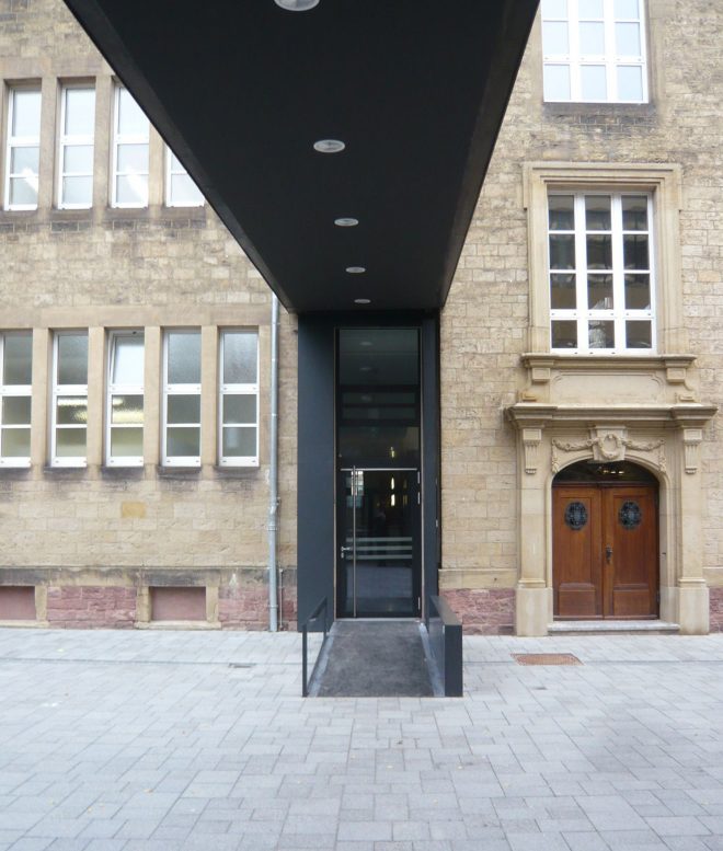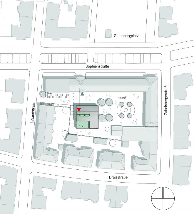 Das Gebäude reagiert differenziert und respektvoll auf die beengten Grundstückverhältnisse und beansprucht durch seine Kompaktheit, einhergehend mit einer minimierten Erdgeschossfläche, die geringstmögliche Fläche des Pausenhofs. Da die Erdgeschossfassaden weitestgehend transparent ausgeführt wurden, entsteht der Eindruck, dass der Pausenhof durch das Gebäude hindurchfließt und seine Fläche durch den Neubau nicht reduziert wird. Innen- und Außenräume verbinden sich, nicht einsehbare und nicht nutzbare Freibereiche werden vermieden. Die Innenräume weiten sich bis zu den Schulhof umsäumenden historischen Sandsteinmauern, die den Schulhof umsäumen.