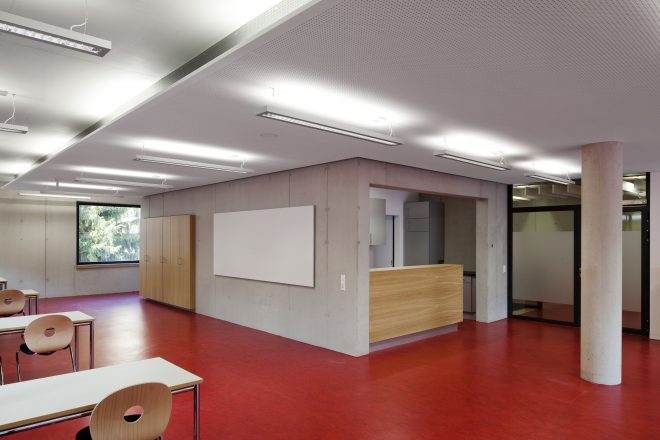 Mit dem Neubau werden die Fehlflächen im Bereich der Ganztageseinrichtungen, und im Lehrer- und Klassenbereich behoben. Gleichzeitig wurde das denkmalgeschützte Bestandsgebäude teilsaniert, eine behindertengerechte Erschließung nachgerüstet und moderne, zeitgemäß ausgestattete Fachräume geschaffen.