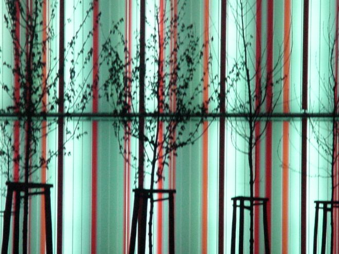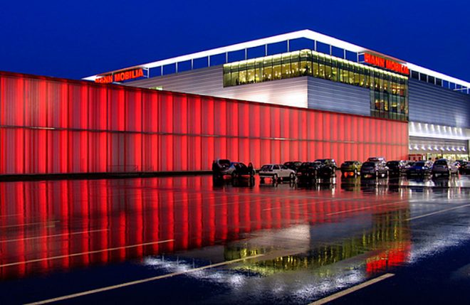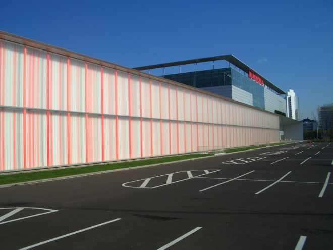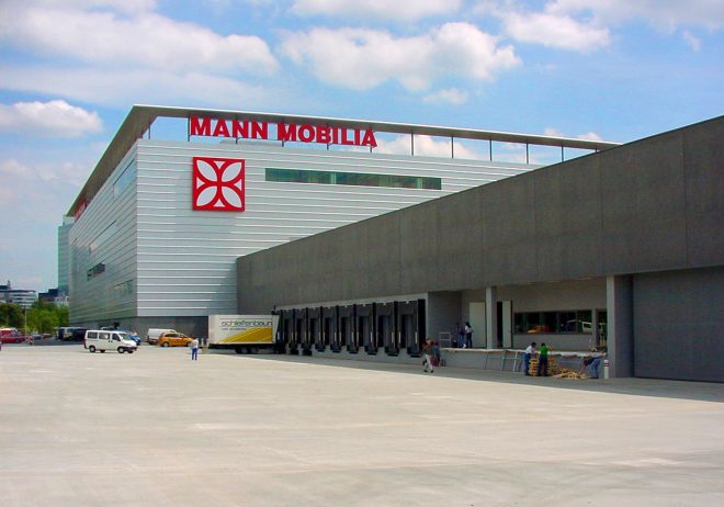 Das Einrichtungshaus zeichnet sich als markanter, fünfgeschossiger Kubus an der Peripherie von Eschborn ab. Ein zweigeschossiger Baukörper bildet die Basis des Gebäudes und integriert den großzügigen Eingang, den Mitnahme-SB-Markt sowie die Lager- und Anlieferbereiche. Die mehrgeschossige Verglasung über dem Eingang gewährt Einblick in die Möbelwelt und das Restaurant im obersten Geschoss.