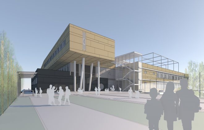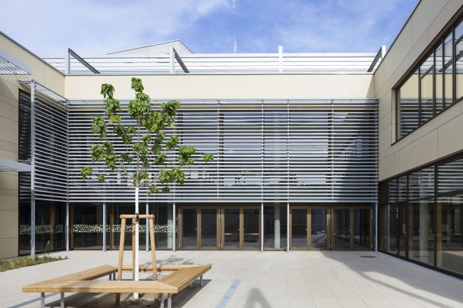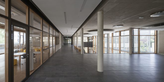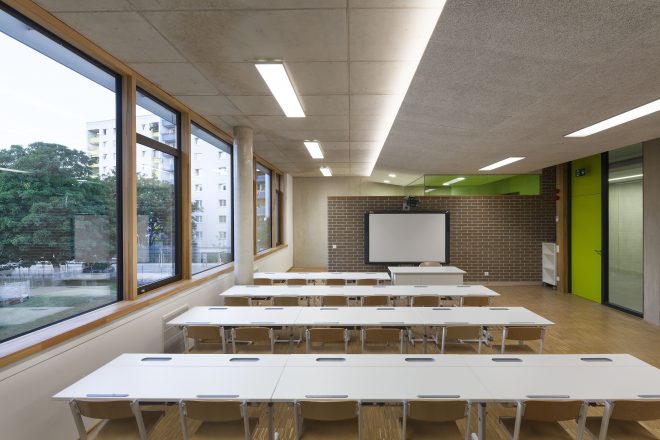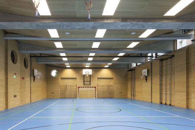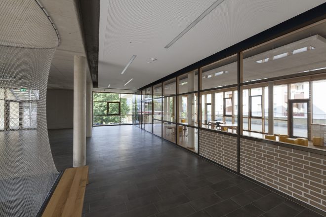 „Der Baukörper der neuen Volksschule bildet ein eigenständiges Volumen um ein streng rektanguläres Raumgerüst, welches sich um die zentralen Freiräume entwickelt und so eine klare Erschließung und Orientierung ermöglicht.“