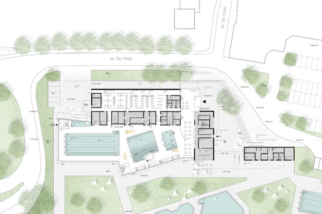 Der Eingangsbereich des Hallen- und Freibades definiert einen klar gegliederten Vorplatz mit großzügigen Aufenthaltszonen und ausreichend Fahrradstellplätzen. Während sich die Freibadbesucher überwiegend in den Südosten des Geländes orientieren, bewegen sich die Hallenbadbesucher nach Südwesten. Die Wege der beiden Besuchergruppen kreuzen sich dabei nicht, sodass die Besucherströme gleichmäßig verteilt werden.