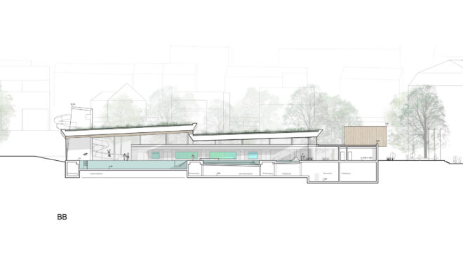 Die festgelegte Baugrenze wird eingehalten. Durch die im Nordwesten gestaffelte Gebäudestruktur, die auf die bestehenden Freibadbecken reagiert, entsteht eine räumliche Verbindung zwischen Hallenbad und Außenraum. Zur Stadtseite hin präsentiert sich das Gebäude als klar strukturierter, rechteckiger Baukörper, während es sich zur Freibadseite mit polygonalen Formen und freischwebenden Pultdächern lebendig in die Landschaft einfügt. Das Erdgeschoss ist so angeordnet, dass es im Hochwasserfall geschützt bleibt.