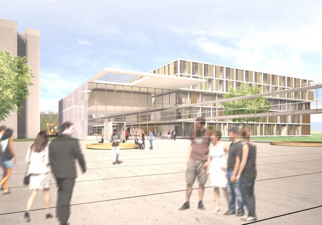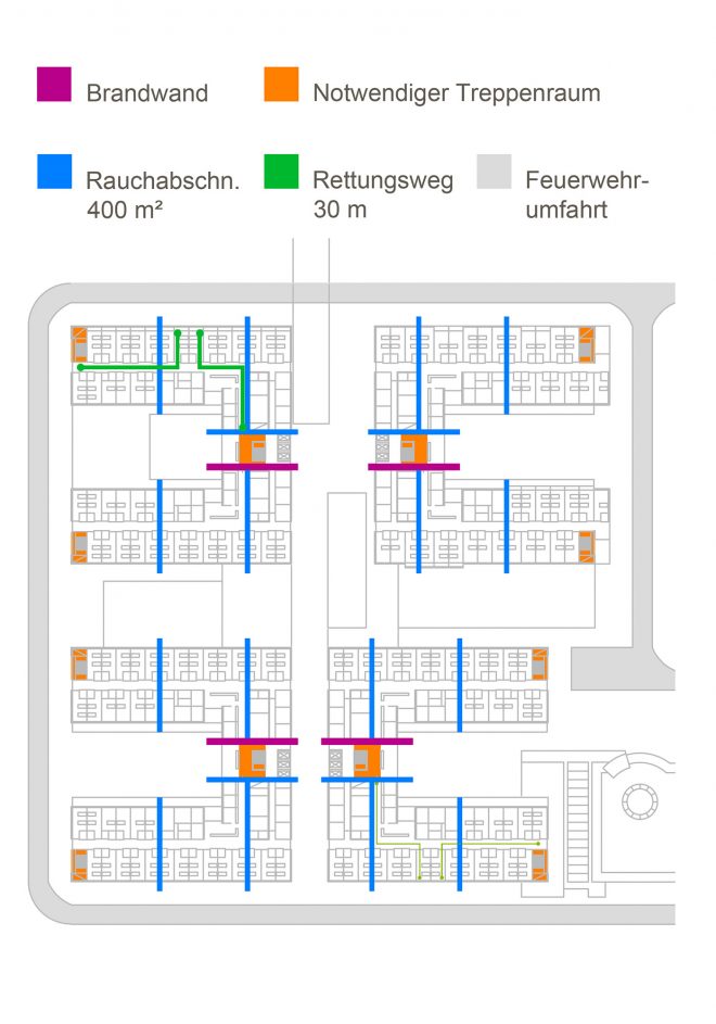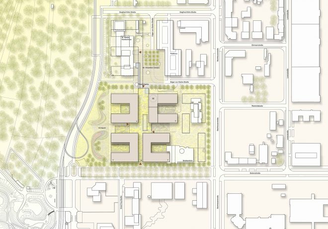 Prägnante Zäsuren und Innenhöfe gliedern die Struktur, erzeugen möglichst große Freiräume zwischen den Gebäudeteilen und ermöglichen eine landschaftliche und funktionale Durchlässigkeit in Nord- Süd- und West-Ost-Richtung. Die offenen U-förmigen Bauteile verzahnen sich mit der Grünfläche des Beiertheimer Feldes und lassen auf der Ost-Seite eine vielfältig nutzbare Erweiterung zu.