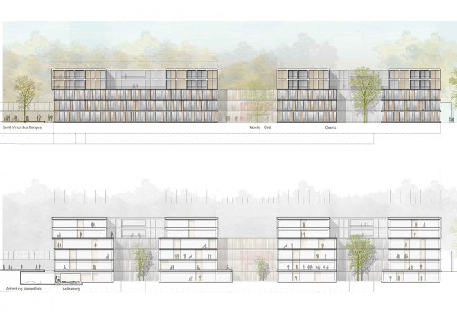 Der Baukörper des Neubaus besetzt die westliche Baukante, nimmt im Süden die Bauflucht der Strahlenklinik auf und fasst gemeinsam mit der Marienklinik und dem geplanten Parkhaus den neuen St. Vincentius-Campus. Auf einem dreigeschossigen Funktionsgebäude sind zwei zweigeschossige Bettenbauten angeordnet.