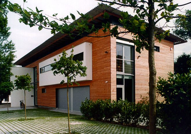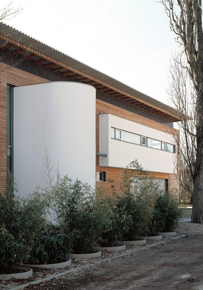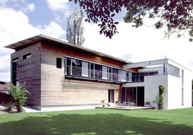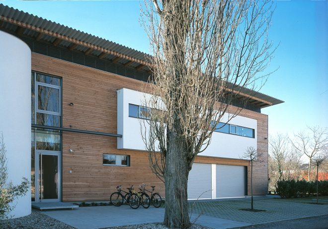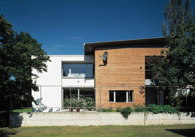 Aus der ‚robusten Holzkiste‘ schieben sich glatt verputzte Körper, die sie akzentuieren und mit der vorhandenen Bepflanzung einen geschützten Freibereich auf der Südseite bilden.