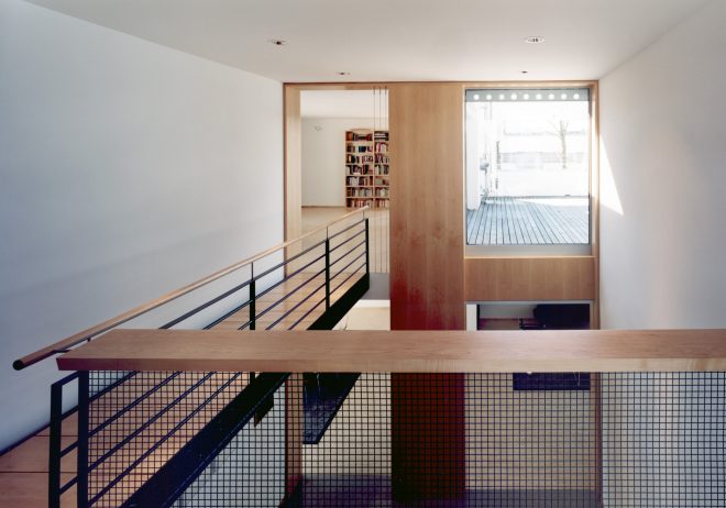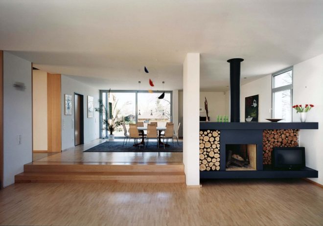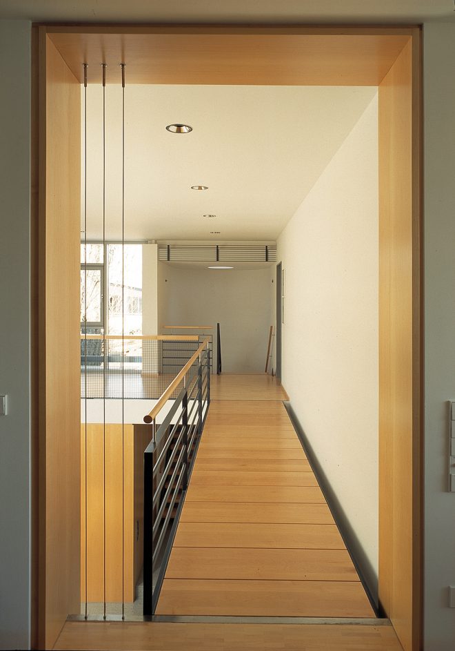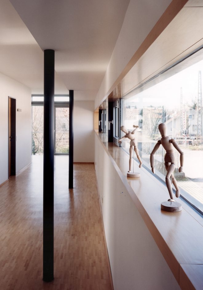 Alle Aufenthaltsräume orientieren sich über große Fensterflächen nach Süden. Nebenräume und Flure begleiten die eher geschlossen wirkende Nordseite zu Straße und Sägewerk.