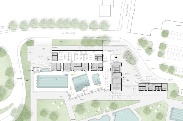 Die festgelegte Baugrenze wird eingehalten. Durch die im Nordwesten gestaffelte Gebäudestruktur, die auf die bestehenden Freibadbecken reagiert, entsteht eine räumliche Verbindung zwischen Hallenbad und Außenraum. Zur Stadtseite hin präsentiert sich das Gebäude als klar strukturierter, rechteckiger Baukörper, während es sich zur Freibadseite mit polygonalen Formen und freischwebenden Pultdächern lebendig in die Landschaft einfügt. Das Erdgeschoss ist so angeordnet, dass es im Hochwasserfall geschützt bleibt.