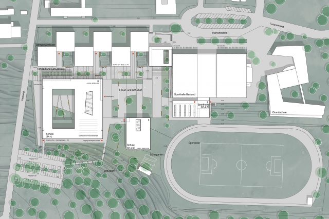 Das Gebäudeensemble der Integrierten Gesamtschule Stierstadt (Oberursel), bestehend aus Neubau Schule, zweiter Bauabschnitt Schule, Neubau und Bestand Sporthallen und den vorhandenen Jahrgangshäusern , gruppiert sich attraktiv um das neue Forum, das gleichzeitig Schulhof ist.