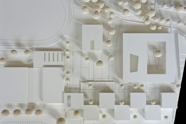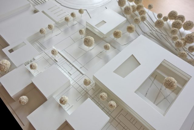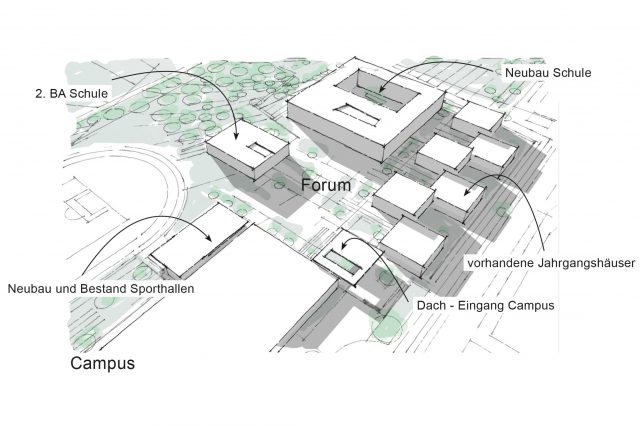 Das neue Schulgebäude ist eine dreigeschossige kompakte Vierflügelanlage mit Innenhof und mehrgeschossiger Erschließungshalle. Der zweigeschossige zweite Bauabschnitt der Schule komplettiert als Solitär den Campus. Die neue Sporthalle wird an die vorhandenen Sporthallen funktional optimal angebaut. Eine großzügige Treppen- Rampen-und Sitzlandschaft verbindet harmonisch die Ebene der Bushaltestelle und das Forum.
