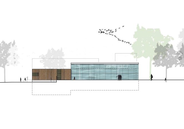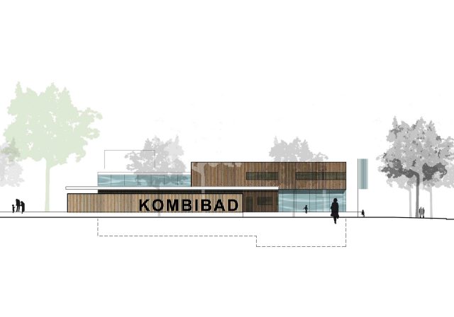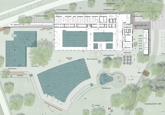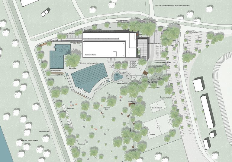Der Neubau der Schwimmhalle und die neu positionierten Außenbecken des Freibades fügen sich selbstverständlich, aber bewusst eigenständig in die Umgebung ein. Als prägnanter, kantiger und kompakter Solitär steht das neue Gebäude selbstbewusst in der heterogenen Umgebung. Das Bestandsbecken des Freibades bildet mit dem neuen Erlebnisbecken und dem Hallenbad ein Ensemble, das die große Bestandseiche im Nordwesten der Anlage in Szene setzt.